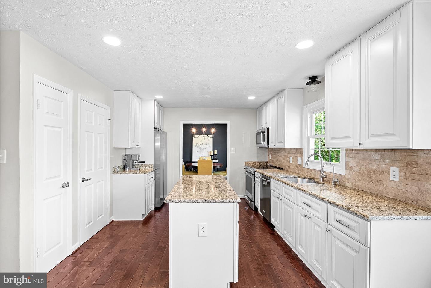 The main level includes a spacious living room for gatherings, an elegant dining room for memorable meals, and a well-appointed kitchen with white cabinets, stainless steel appliances, and granite countertops. The cozy breakfast area, framed by a bay window, overlooks the expansive backyard. The family room, with its brick accent wall and wood stove, opens to a large deck, while a stylish renovated powder room and a mudroom/laundry area leading to the 2-car garage complete this level.